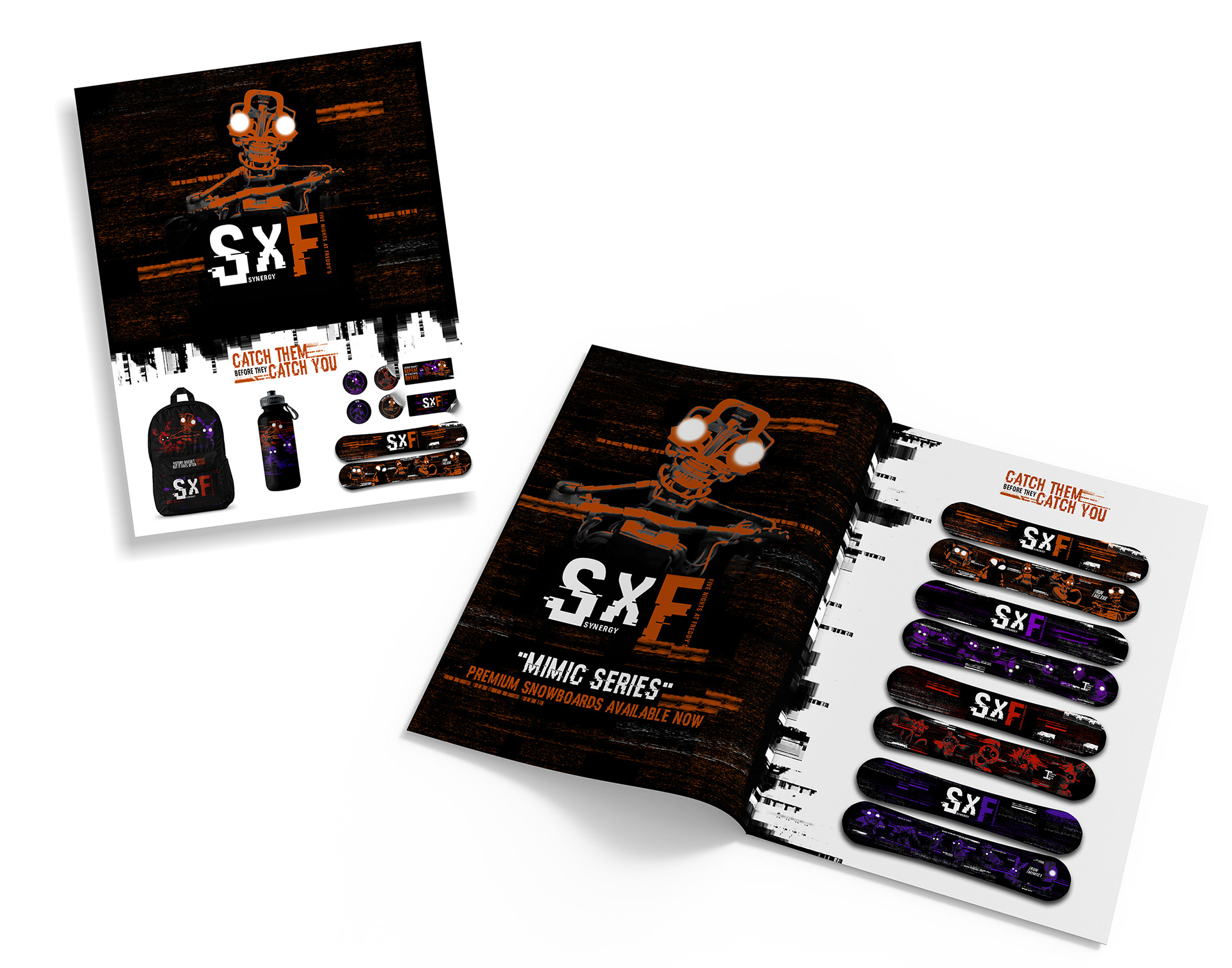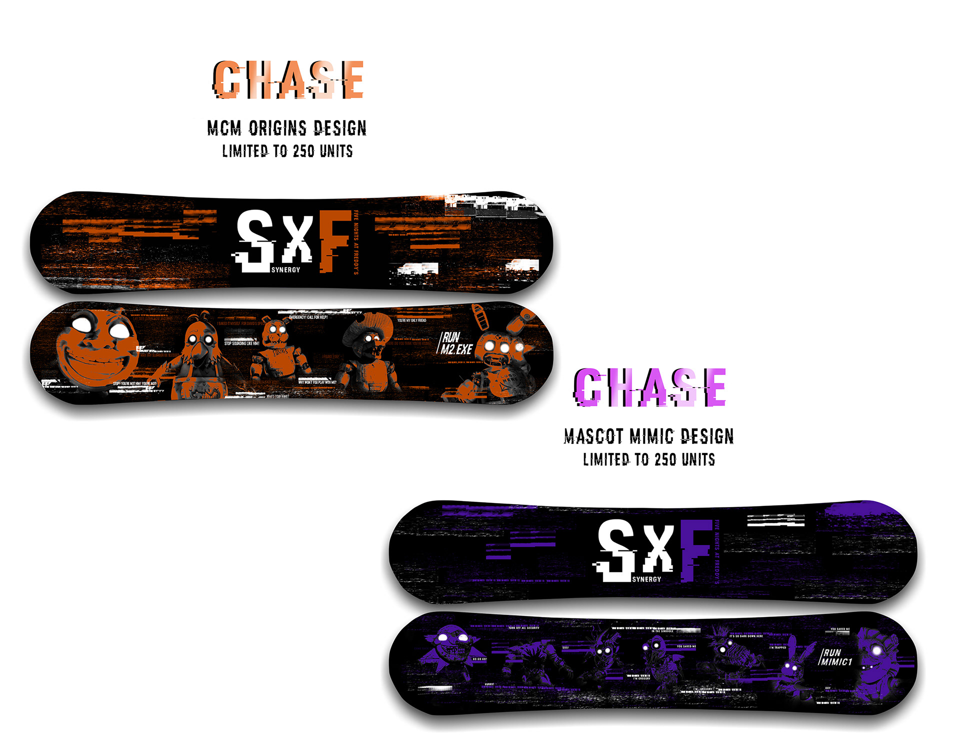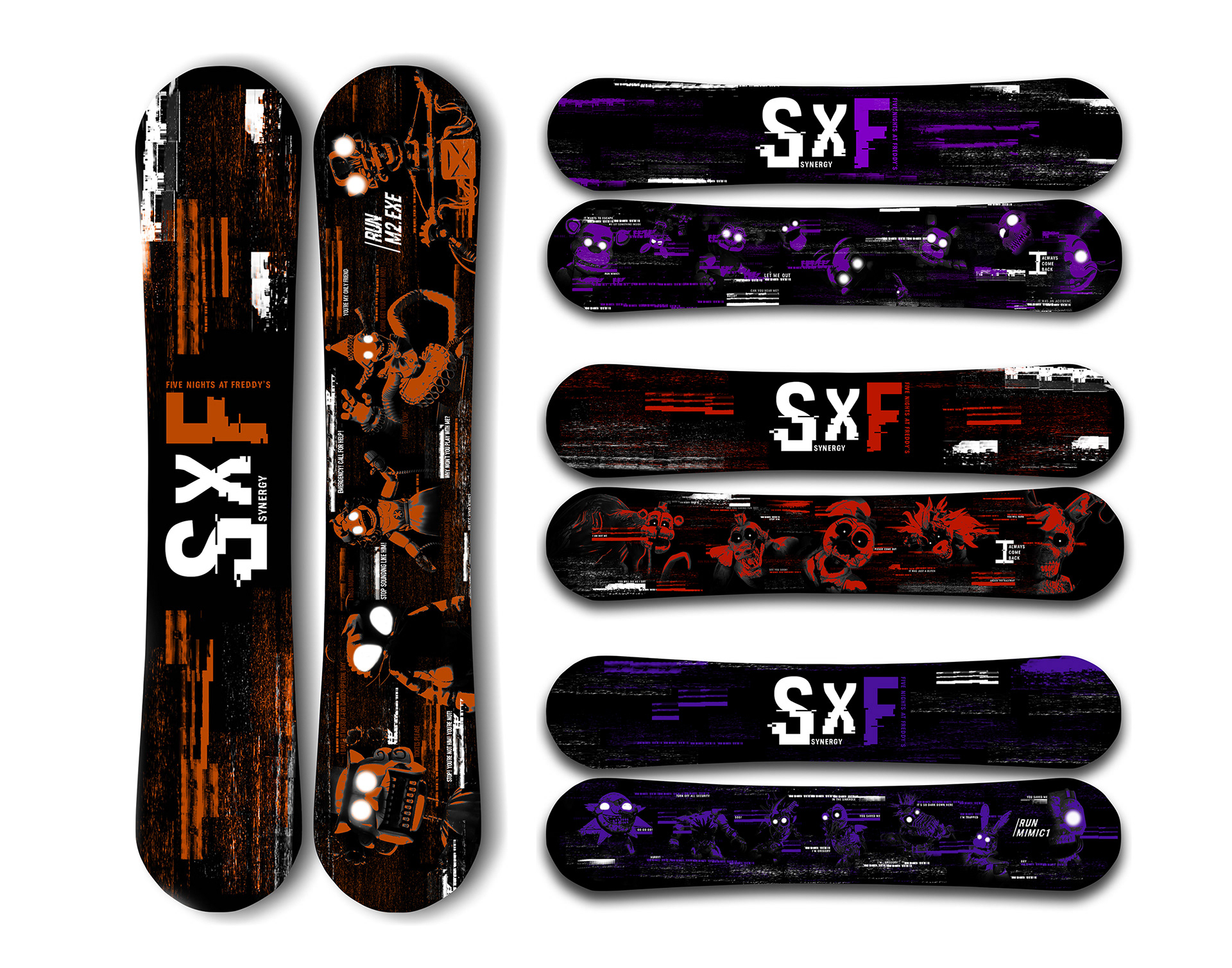 History doesn't repeat, but it does often rhyme. This collection of snowboards & sports gear was designed around "The Mimic" from the "Five Nights at Freddy's" series. Divided by 4 different games, each one shows off the various forms The Mimic takes & most importantly the many other robots it has control of.
